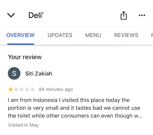 Deleting our reviews 2.Denying we ate there (as if we cannot read their menu and identify which restaurant we went to) 3.Responding our review using Indonesian assuming we cannot speak English(even tho the review was in English)