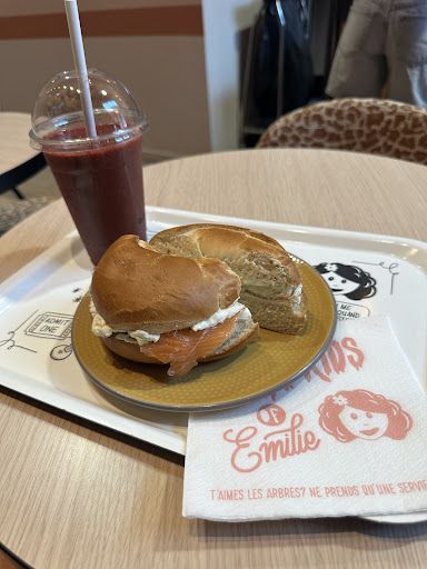 La carte nâest pas trĂšs variĂ©e et surtout, les portions ne sont vraiment pas gĂ©nĂ©reuses. Un pauvre morceau de bacon coupĂ© en deux et deux tomates câest un peu abusĂ© pour le prix. En revanche, beaucoup, beaucoup, beaucoup trop de cream cheese (quand il en resteâŠ) qui noie le peu dâautres ingrĂ©dients qui se battent en duel.