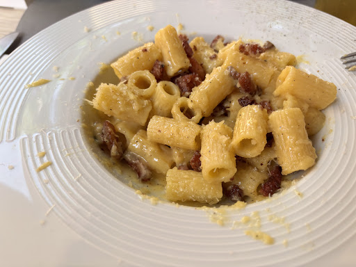 I have been a spaghetti carbonara lover since before it was a common menu item and I'm always on a search for a good version of it (and I find most versions are just "ok"). We stayed in wonderful Menton for 4 nights and I only wish I had come here sooner than the last night. This was possibly the best I've ever had! For once the pancetta/guanciale/pork was cooked to perfection. The flavor was incredible. My wife had a fantastic pizza and we shared a nice bottle of wine. It was a rainy evening and we sat outside in their sidewalk seating, but there was a nice see through covering and heaters, so the atmosphere was wonderful as the rain hit the cover above us. Service was perfect and the prices were very good. Loved it and hope to be...