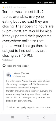 Read moreTerrace was almost full , 2 tables available, everyone eating but they said they are closing. Their opening hours are 12 pm- 12:30am. Would be nice if they updated their programe everywhere online so that people would not go there to eat just to find out they are closing at 3:40 PM. RE: I appreciate the prompt reply from the owner , trying to put the blame on me for not being understanding about the staff that need to rest for one hour. I am a very kind and understanding person and probably would have waited for one hour (especially after driving for half an hour to eat there) but I was just told that ,,we are sorry, we are closing, come back another time". I noticed now that putting the blame on everyone that does not leave a good review is a custom...