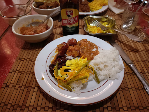 Nous avons été accueilli par un jeune homme un peu timide à l'ouverture du restaurant qui a installé les tables au fur et à mesure. Simplicité donc et authenticité d'une cuisine familiale-maison. Puis il a mis en route la petite musique créole, un p'tit Zouk love... Il nous a présenté l'ardoise du jour modestement dont les plats s'annoncent dépaysants. ...mais je n'ai pas trouvé mon boudin extraordinaire bien que bon. Samoussas, ok... Le Achard très frais. CariZourite, ok... Riz...on Cari saucisses...ok... Haricots rouges...ok.. ...le piment... Tarte de coco en dessert...