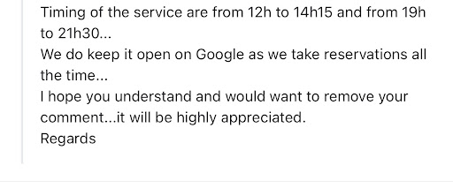 Out of fairness, I’ll update my review to a neutral 3 stars. But I will also include a photo of your actual posted hours so others don’t make the...
