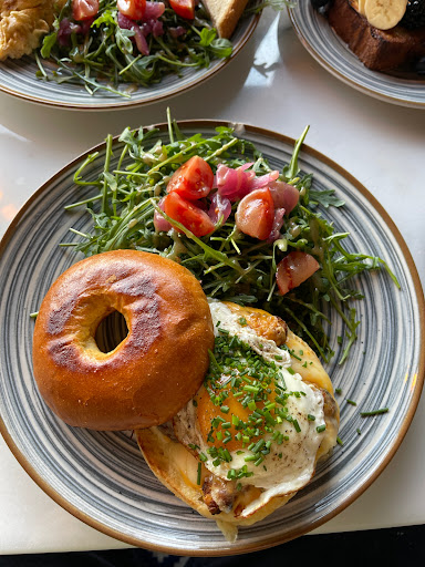 About 12 minutes later, a server delivered the order to our table. I ordered the chicken bagel; it was on a fresh baked bagel with great consistency for a sandwich and included breaded chicken, cheddar cheese, emmental and was topped with a perfectly poached egg. It was also accompanied by a dressed wild arugula salad. We also enjoyed the scrambled eggs with bacon, which were soft, creamy and delicious. The third item was maple French toast with fresh fruit. And enjoyed brunch with a Nutella cappuccino.