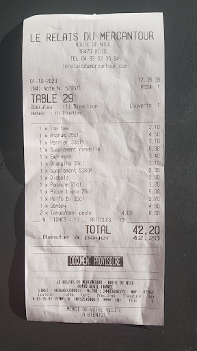 La note s'élevait à 42€ mais j'ai été choqué par le supplément rondelle de citron (0,30€) dans un Perrier et supplément sirop (0,30€) avec mon orangina déjà à 3€10 ! Cette pratique très mal vécu par les clients (la preuve !) n'est pas vraiment illégal en soit à condition que ce soit affiché sur la carte ou dans l'établissement ou annoncé par le serveur. Ce n'est pas du tout le cas dans mon histoire. Ce relais est juste une station service qui sert à boire à des années lumière d'un lieu touristique.
