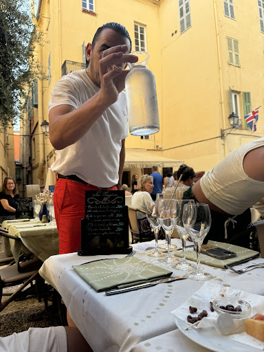 DO NOT EAT HERE. Complete scam of a place. Service and food way under par and overinflated prices. My 2 friends and I came here to have appetizers and drinks. We ordered a large dish that we intended to share and an aperol spritz and some bottled water. The dishes were super over priced for what they were. The servers were extremely rude from the moment they saw we were young adults and seated us in the corner. The server then whispered something in French to another waiter and came back saying we need to order 1 dish per person minimum, which was 100% an arbitrary rule to scam young travelers that don’t know better. When my friend who got her drink said okay then we’ll leave when she finishes her drink, he got upset and started acted really cold to us all. He immediately brought her the check so she could pay and make us leave as soon as possible so he could turn over the table faster for a quick buck. She payed and he started his tantrum of which he came back 4 times to berate us. She was finishing her drink when he overheard me saying I was thinking of leaving a bad review with my phone out on the Google reviews page up. He started yelling at my 2 friends who knew French saying “how are you going to expect 5 star service when you order water”, he when on to say I was psycho in French, all the while none of us responded because he seemed like a very ego driven small man that would use any sort of response to further continue his freak out. He said I was a bad person for leaving a review and stood over our table to continue to yell at my friends for not spending more money?? It was so out of line. I have been a service worked all my life and cannot even imagine treating a customer - let alone another human in that way! Completely insane. Someone told us that they pay people to leave good reviews or offer them dessert in exchange for a good review. Complete scam of a place preying on tourists for easy money. Could not recommend less. Also here’s a picture of the man yelling at us about...