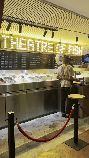 Pesca offers a fresh and theatrical approach to dining—a definite talking point. The experience begins at the fish counter, where you order from a constantly changing menu displayed on a retro-style flip board (think old airport departure signs, complete with the nostalgic clicking sound). It’s a fun and novel idea, adding drama to the ordering process. There’s even a cinema-style seating area in front of the counter to take it all in.