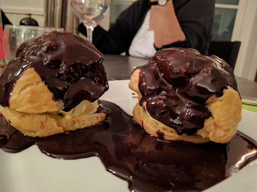 I started off with Carpaccio of beef with a strong herb (sorrel?) dressing. It was decidedly yummy. The steak was very rare in the middle, but crispy cooked on the outside. Very very yummy as well. I finished with two giant...