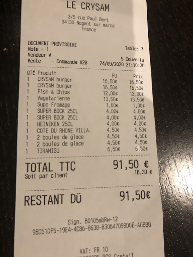 Read moreJuste le plus bon Burger de Nogent-sur-Marne ! Le "Burger Savoyard" du restaurant Le Crysam est tout simplement exceptionnel! La viande de bœuf est savoureuse et juteuse, et la combinaison de Reblochon fondu, de galette de pommes de terre rissolées, salade et pickles d’oignons est absolument divine. La présentation est également impeccable, avec une belle assiette et une présentation soignée. En plus de son goût incroyable, le "Burger Savoyard" est également très copieux, ce qui en fait un excellent choix pour un déjeuner, une soirée dîner entre amis ou en famille. Les portions sont généreuses et la qualité est excellente. Je recommande fortement le "Burger Savoyard" du restaurant Le Crysam à tous ceux qui cherchent un burger savoyard authentique et délicieux. C'est un véritable régal pour les papilles et un vrai plaisir pour les yeux. Je suis sûr que vous apprécierez chaque bouchée de ce délicieux burger savoyard! Servi par une équipe...