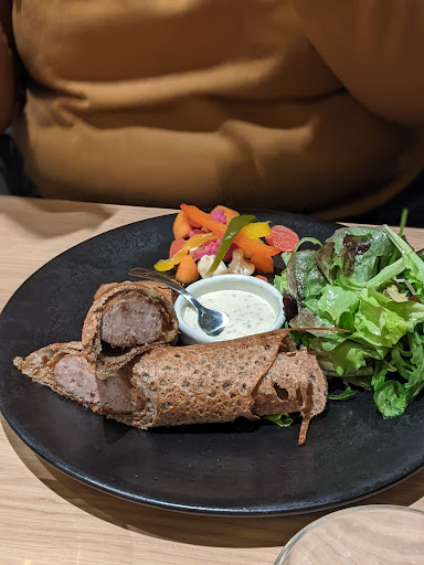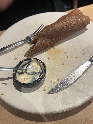 Read moreLes crêpes sont bonnes surtout pour celles un peu plus recherchées. En revanche, les classiques (jambon, fromage) manquent un peu de saveur même celle à la truffe. De manière générale, c'est quand même très cher pour des crêpes, la rentabilité doit être au max... On a été déçu du service (un lundi soir), l'une des serveuses n'était pas très aimable, a à peine écouté la commande et est parti avant qu'on ait tous dit les boissons qu'on souhaitait donc on a du la retenir. Finalement elle est revenue 5 min plus tard pour redemander à la moitié de la table ce qu'on avait commandé... ça s'est soldé par une erreur dans l'un des plats commandés. Tout le monde a attendu le plat manquant qui est arrivé un bon 20 min plus tard... On a donc tous mangé froid sauf l'assiette arrivée en retard... Quand le resto fait une erreur ça semble pourtant évident que la commande doit être relancée directement or des dizaines de crêpes sont sorties pour les autres tables avant que celle manquante n'arrive. On a même fini par les relancer de peur qu'ils avaient oublié la crêpe manquante. Un peu déçue d'autant plus qu'il n'y a pas eu de geste...