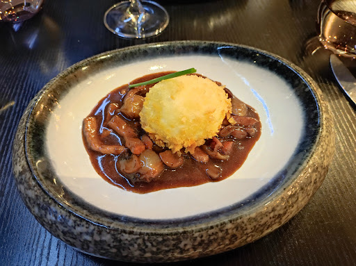 Dans l’assiette ? Inégal, décevant. L’œuf mollet à la crème de cèpes était le plus réussi du repas. La terrine de campagne, elle, était extrêmement grasse, sans subtilité. Les plats principaux ont creusé la déception : un paleron de bœuf normalement mijoté (et donc fondant), ici servi sec comme une semelle, très probablement réchauffé au grill après avoir été séparé de sa sauce. Résultat : une viande desséchée, sans fondant, accompagnée d’une sauce à part, dans une verrine, beaucoup trop salée et d'une acidité déséquilibrée.