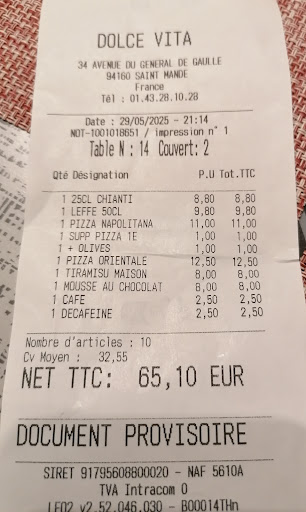 Côté assiette : j’ai pris une pizza Margherita, un bon moyen de juger la qualité des produits simples. Résultat : un excès de sauce tomate au goût très moyen, qui donne l’impression de manger un bocal de purée de tomates. Clairement, « La Dolce Vita" ne porte pas bien son nom.