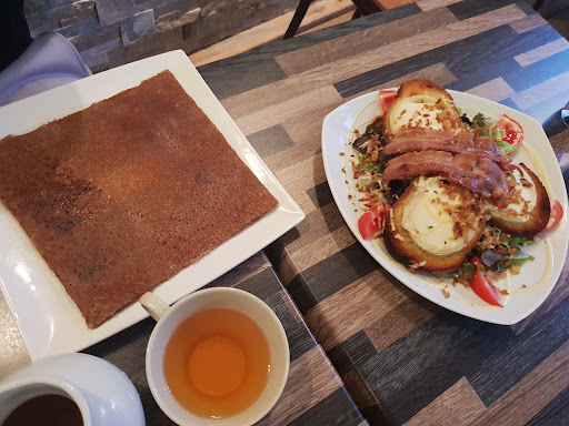 Nouveau petit coin gourmand de vingt sept places assises, très agréable, pas grand espace mais très bien agencé, on mange à deux, quatre, ou cinq sur des tables bien pensées, sans être confinés. Décoration réalisée avec goût. Crêpes froment très bonnes, la seule petite déception a été la garniture apposée sur le dessus de la galette et non à l'intérieur. Tous les ingrédients sont frais, cuisinés maison, assaisonnés à souhait. Les salades sont topissimes, fraîches, goûteuses et présentées avec raffinement. Tout pour mettre en appétit, savourer son repas et passer un véritable agréable moment ! Même si nous étions rassasiés, nous nous sommes laissés tenter par un dessert... les coupes de glaces sont appétissantes, dans la continuité des suggestions, mais nous nous sommes arrêtés sur les Crêpes sucrées, qui sont tout bonnement excellentes ! Autant la pâte que la cuisson : parfaite. Service discret, professionnel, souriant, connaissance des produits, suggestions véritables....... quel bon moment, quel bon repas ! Prix raisonnables, rapport qualité/prix imbattable. À venir découvrir du lundi au samedi,...