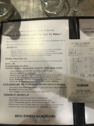 Read moreÀ la recherche d'une expérience gastronomique mémorable dans un cadre élégant et intimiste ? Ne cherchez pas plus loin que La Table du Marché. Dès l'instant où vous franchissez les portes de cet établissement, vous êtes accueilli par une ambiance tamisée qui invite à la détente et à la convivialité. La disposition soignée de chaque table et la décoration sobre ajoutent une touche de raffinement à l'espace, créant ainsi un cadre idéal pour savourer un repas inoubliable.