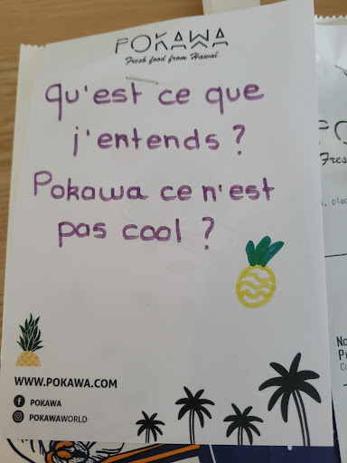 Read moreAlors moi j'ai eu une drôle de surprise aujourd'hui. Je commande régulièrement, et j'étais toujours contente. Mais aujourd'hui j'ai reçu du riz "rassis", je pense que c'était du riz de la veille, il était tout sec et collé. Et puis au moment de jeter le sac, je vois le mot dessus. D'habitude, il y a un mot sympa, là je lis "Qu'est-ce que j'entends ! Pokawa c'est pas cool ?". Je me demande ce que ça veut dire. Et puis je me demande si on ne me confond pas avec quelqu'un d'autre. Je viens voir les avis, et paf, je vois le commentaire d'une autre Anaïs à 1 étoile... Et je réalise que j'ai été saquée à la place d'une autre. Pas de bowl pour moi ! Anaïs, c'est drôlement courant comme prénom, faut se méfier quand on veut se venger 😕 Je laisse 3 étoiles, car toutes les autres fois, j'ai été très contente de ma commande, mais franchement, c'est pas correct de faire ça, je n'avais rien fait pour mériter ça 😔 Et puis même si j'avais été l'autre Anaïs pas contente, ce n'est pas comme ça qu'il faut s'y prendre pour redorer son blason, au...