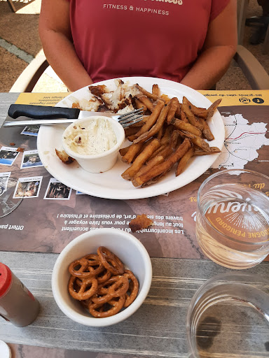 Very disappointing I ordered the plato du jour of veal and green beans My wife had fish and chips I couldn't believe the plate of fish and chips! The chips looked old and looked like they had been regheated, very overcooked and the fish had overcooked dark batter! My veal was gristly, tough and chewy The waitress was quick to serve us and take our order but certainly didn't ask if everything was all right or why the fish and chips were left...