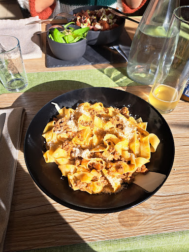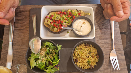 Had a nice lunch here with my family. This place has avvegetarian focus but plenty for people that prefer otherwise. I had a pasta Carbonara that was quite tasteful, not in least because of the excellent fresh pasta and parmesan on the side. I had a taste of the vegetarian gratin/tomate/aubergine which was tasteful and original as well. Our young one was happy with his junior pizza with EXCELLENT dough. Wines: mostly local and a nice variation to choose from at that. If you're a true hard core meat eater you'll be disappointed but anyone else will have a very...