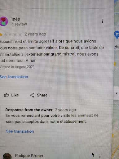 PS #1 suite aux commentaires du propriétaire : initialement nous avions mis 5 étoiles mais vu votre réponse absolument délirante nous baissons hélas à 1 étoile. Nous ne pouvons à nouveau que vous encourager à suivre des formations pour vraiment apprendre et comprendre ce que c'est l’accueil, l'approche client, le mettre à l'aise, le choyer, etc. C'est vraiment fondamental si vous voulez réussir dans la restauration (et ailleurs). Vous verrez, ces formations vont vous faire découvrir plein de choses, vous ouvrir le yeux! Pour notre chien refusé, ce n'est pas grave du tout, mais notez que cette information n'apparaissait pas sur votre site (à revoir d'ailleurs car il ne donne pas envie de venir), et que votre sms n'a été envoyé que moins de 2 heures avant le repas alors que nous avions réservé la veille. Le problème, hélas, c'est votre comportement non seulement à l’accueil mais tout au long du repas, votre approche et vos commentaires un peu bizarres, etc. alors que vos clients viennent chez vous pour passer un bon moment! Tout cela manque beaucoup de professionnalisme voir même d'humanité. C'est vraiment dommage. Vu votre réponse agressive et plein de rancœur malgré nos commentaires encourageants (vous n'avez pas remarqué le positif et les 5 étoiles ?) j'en déduis que la vie n'a pas dû toujours être facile avec vous, mais là vous vous torpillez vous même... Soyez à la hauteur de la cuisine de votre épouse, bon sang! Et bonnes formations!