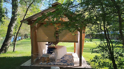 The area has a restaurant and a park. They blend together very well. The park consists of many picknick tables and benches, a grill to get snackbar food, a bar for drinks, jeu de boules lanes and a creek running in the back. The restaurant had beautiful seating areas and the food was great. Also the service was friendly and pretty timely despite the busy evening.