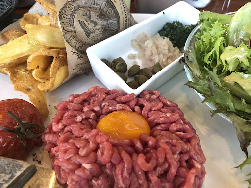 Read moreJe ne sais pas si ça a changĂ© de propriĂ©taire, mais ça faisait un moment que je n'y Ă©tais pas allĂ© et c'Ă©tait catastrophique. Les menus imitation journal papier, c'est rigolo, mais quand il sont trop rĂ©utilisĂ©s il se remplissent de taches de gras et se dĂ©chirent... Ăa met en confiance Dans le menu enfant, il est annoncĂ© des tenders. Surprise, ce sont de nuggets. Les tenders, c'est un morceau de filet de poulet panĂ©. Les nuggets c'est du poulet reconstituĂ©. Si je commande une entrecĂŽte et qu'on me sert un steak hachĂ©, ça va m'agacer... Le steak tartare est servi sans assaisonnement. Ne me dites pas qu'il fallait que je rĂ©clame la Worcester ou le Tabasco, ça doit ĂȘtre amenĂ© avec systĂ©matiquement. Si j'avais pris une salade, j'aurais dĂ» rĂ©clamer la vinaigrette ? Les frites surgelĂ©es, OK, mais les frites surgelĂ©es molasses (pas molles, non, molasses) c'est un gros point noir. Il nous a fallut un couteau pour couper le moelleux et le baba au rhum Ă©tait sec comme du pain rassis. Et en gĂ©nĂ©ral, on le sert soit avec de la crĂšme pĂątissiĂšre, soit avec de la chantilly. Certains donnent mĂȘme un petit shot ou une pipette de rhum pour bien imbiber le baba. LĂ , rien. Au moment de rĂ©gler l'addition, personne derriĂšre la caisse. La queue est arrivĂ©e Ă une demi douzaine de personnes avant que quelqu'un vienne, et encore c'Ă©tait laborieux car certains clients parlaient anglais. (non mais quelle idĂ©e, dans une rĂ©gion touristique...) Une pensĂ©e pour notre serveuse pressĂ©e comme un citron qui devait en plus subir les remarques des clients. Bref, un chouette resto...