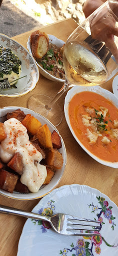 La bâtisse de charme en pierre, qui abrite aujourd’hui le restaurant et les chambres d’hôtes, a vu naître bien des générations. Nous prenons place devant le bar dans la salle traversée de poutres au plafond. Madame de Sévigné et sa fille Françoise- Marguerite, comtesse de Grignan, déjeunent avec animation, en décalage temporel, à une table voisine. Nous choisissons de faire honneur à différentes petites assiettes dont le contenu est fait maison avec des produits locaux, bio pour la plupart. Nous jetons notre dévolu de concert sur de l’houmous, sur une tarte fine aux asperges vertes, sur des patatas bravas agrémentées de leur incontournable sauce aïoli et sur un Picodon demi-sec mariné aux herbes sur un léger lit d’huile d’olive. Un moment de plaisir visuel, une parenthèse poétique tant les mets sont présentés avec art, créativité et beauté, précède un festival de sensations enchanteur pour les papilles gustatives qui se délectent avec émerveillement de toutes ces saveurs. Les minutes complices ralentissent leur écoulement, comme autrefois, pour magnifier ces instants de plaisir gustatif uniques et éphémères enregistrés à jamais dans la trame temporelle.