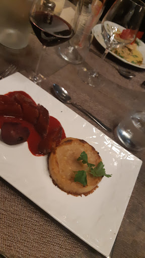 Entrée: 24 euros pour deux morceaux de foie gras de 5 à 6 cm de diamètre (j'ai vu des photos sur de précédents avis ou il y en avait trois. Recherche d'économie?). Bon, mais sans plus. J'en ai goûté des bien meilleurs, en quantité plus généreuse et bien moins chers. A 300m de là. Au milieu de l'assiette, un grand rectangle de gélatine translucide: la gelée de sureau. Aucun goût. C'était donc juste de la décoration? Le foie gras servi avec 3 ridicules morceaux de toast. Pas d'autre agrément (confiture de cerise noire, confiture de figue, confit d'oignons, le choix ne manque pas pour qui veut faire simple et efficace).