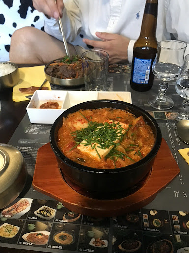 Read morePetit restaurant à la devanture sans prétention, le lieu est décoré à la culture pop mais épurée. Les canapés en simili peau de vache déroutent un peu mais très vite les effluves de la cuisine augurent d'un bon moment gastronomique. L'accueil du patron et de son équipe est courtois et le service s'effectue sans fausse note. La cheffe est affairée en cuisine et énonce de sa douce voie chaque commande. Nous décidons de prendre une entrée et un plat, de goûter aussi aux alcool Coréens ( bokbunja et soju parfumé). Aussi, en lisant la carte nous dégustons les appetizers offerts par la maison, simples mais de bon goût... poulet frit TTAK TUIGIM, boulette de porc TTEOK GALBI, raviolis GUN MANDU sont une tuerie, vraiment très bons, doucement parfumé et piment justement dosé pour les boulettes. Ensuite , nous continuons avec le bœuf mariné BULGOGI, le poulet frit au miel YANGNYUNM TTAK et enfin un BIBIMBAP au bœuf sauté. Les quantités étaient vraiment très suffisantes. Les aveurs étaient extraordinaires, une réelle découverte. Au final une superbe adresse très bon marché et vous passerez un moment délicieux sans vous ruiner mais avec des souvenirs gustatifs...