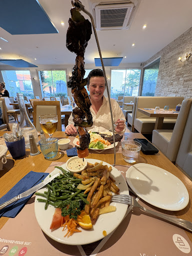 Nice looking, tasteful decor, rather too brightly lit, friendly staff and very popular and crowded, it looked perfect but the food was hugely disappointing. Maybe we just ordered the wrong things.. my husband's entrecote was good but the chips were a pile of very greasy brown mush. I had the Caesar salad which would have been nice if the chicken wasn't overcooked, it was very dry and hard, and the worst was my aunt's meal which was turkey in a creamy sauce.. it honestly tasted like a cheap packet sauce mixed up from a powder and was very salty. She got the nasty grease soaked brown chips too. Oh, and we had prawn beignets for a starter which were quite nice but very like Findus crispy pancakes. It was altogether a very disappointing meal and not cheap either. Shame, coz it looked so promising. Most people seemed to order hanging brochettes which looked...