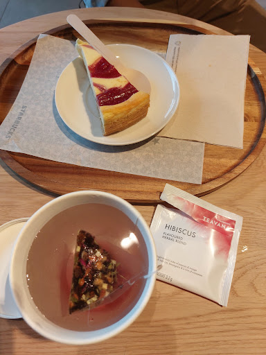 Quick visit today for a traditional Starbucks takeaway Gingerbread Latte (it’s the season!). Coffee was okay although there were crunchy bits in there that I don’t remember having with this particular drink the years before in other Starbucks coffee shops. The chocolate chip cookie was tasty. Prices are typical. The service was fast - I was the only one ordering at the time. The coffee shop was quite full around lunch time. The staff was friendly. It appeared clean and it is a spacious place with a good amount of seating space. A few outdoor tables are available as well. The location is very convenient. Also: the shop has automatic doors. Which is great when pushing a pram and holding a coffee at the same time.