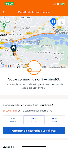 Alors par où commencer l'histoire... je commande mon tacos à 10h45 pour une livraison « initialement prévue à 23h39 » j'appelle le tacos à 23h18 pour prendre des nouvelles normal ils me disent que le livreur est bien parti et que je vais recevoir la commande dans les temps. jusqu'à là aucun souci.. quand tout à coup je m'aperçois qu'il est 23h42 pas de nouvelles de ma commande. J'appelle le restaurant je tombe sur le livreur qui me dit pas de souci j'arrive dans un quart d'heure. si ça s'arrête là ça serait génial mais non.. 23h55 toujours pas de nouvelles je réitère mon appel j'appelle à nouveau le service on me dit pas de souci dans un quart d'heure vous aurez votre commande ok ils me disent qu'il y a beaucoup de commande ça a été le rush je dit je comprends il y a pas de souci.. par contre là il est minuit 21 passer je ne vois toujours pas le livreur.. Alors sur le fond je comprends tout à fait que le livreur peuvent avoir beaucoup de commande à livrer par contre sur la forme le livreur ne m'a jamais appelé pour s'excuser pour me dire que lui aura du retard et que en plus il avait crevé son pneu. Au final j'ai réussi à l'avoir je lui demande de venir livrer à ma porte tout ce qu'il me répond je vais vous appeler quand j'arrive vers chez vous comme ça vous pourrez sortir venir chercher la commande je lui ai dit non pas du tout vous viendrez toquer à ma porte car je peux pas me déplacer.. Je vous jure c'était vraiment pas ma soirée.. elle est pratiquement une heure de retard Le livreur s'est excusé en arrivant il était très gentil alors ça rattrape ...