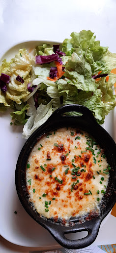 Plats entre 11€50 (pour un plat du jour) et plus d'une vingtaine d'euros pour certaines viandes. Nous avons réussi à nous en sortir pour environ 16~17€ avec mes amis pour un plat et un verre de vin / ou un diabolo. J'ai pour ma part pris le parmentier de canard qui était vraiment bon, le canard était bien cuit et tendre. La couche de fromage sur le dessus du parmentier est également très gourmande. Mon amie a pris un poulet sauce à la crème champignon et pomme de terre grenaille. Elle m'a dit qu'elle adorait la sauce.