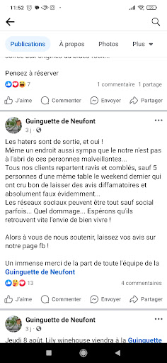 A fuir! manque de professionnalisme, arnaqueurs, et ivres! Nous sommes arrivés à la guinguette, au début tout c’est bien passé et nous avions même été surpris par leur accueil plutôt sympathique, mais c’était sans compter le chaotique déroulement de la soirée. Commande passée à 19h et servie à 19h50 (5 barquettes de frite et 1 burger), la commande finit par arriver, mais ce n’était pas du tout ce que nous avions commandé, 1 assiette de frites, et 1 burger avec des suppléments que nous n’avions pas demandé, nous avons alors indiqué à la serveuse que la commande n’était pas exact, ils nous ont alors ramené 4 autres barquettes de frites et indiqué que les suppléments dans le burger n’était pas payant (donc que le burger restait au prix initial: 8€). Lors de notre passage en caisse nous avons réglé notre commande et nous sommes rendus compte sur le ticket de caisse que les suppléments du burger nous ont été comptés! en plus de cela le serveur a soit disant eu un problème avec son TPE et donc que le premier paiement n’était pas passé, il a donc dû tenter de nous faire régler une deuxième fois (aucun soucis la dessus un problème de TPE peut arriver à tout monde), le problème étant que quand nous sommes rentrés chez nous nous avons vu sur nos comptes bancaires que le paiement est passé 2 fois, nous avons dû retourner la bas pour nous faire rembourser. Arriver là bas nous sommes tomber sur le serveur (qui plus est le gérant) , qui du début à la fin de notre venue à la guinguette était complètement épave, et qui n’a pas manqué de danser et chanter tout au long de la soirée au lieu de servir la clientèle (quel professionnalisme😬👏🏻); le serveur s’est clairement moque de nous , mais bon est ce étonnant vu la quantité d’alcool qu’il a pu ingurgiter? pour lui les erreurs arrivent à tout le monde, pas de soucis je suis d’accord l’erreur est humaine, sauf que quand le service et l’encaissement sont déplorables du début à la fin et qu’en plus aucune excuse n’est faite là on a un problème. enfin bref, évitez cette endroit de fou, mise à part si vous aimez perdre de l’argent...