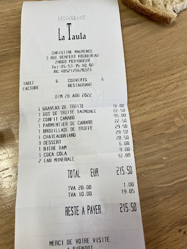 My partner and I visited this wonderful restaurant twice while on holiday in Perigueux for a week recently and we can't rate it highly enough. The food was absolutely delicious, as was the wine and all the little extras. The service was first class and Ter' Raz the waiter is a true professional. He is also very friendly and has a great sense of humour. Christine is an outstanding chef and a very nice lady, she even took the time to bid us a personal farewell on our last visit. We will always remember our visits to Taula. It was definitely the best restaurant out of several we visited during our holiday and we would highly recommend this delightful little gem of a place. Linda & Stuart from...
