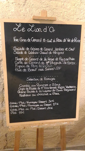 We had come to the area to visit a Brocante market and, being a French long weekend, we found it hard to get a Sunday lunch reservation.||Lion d'Or was not really very close to the market, but we decided that the 30 minute drive was necessary just to get a meal.||We are pleased that we took the chance, as the food was very good... this is food quality and style that it is increasingly hard to find in France these days.||When we first started coming to France about 35 years ago there were about 200,000 bistro/brasseries ... now there are only about 30,000, so many of them closing down because of the high staff costs and the bureaucratic overheads that can cripple a small business. Treasures like this can still be found in some small villages, but they are not easy to find anymore.||The service was a bit hit and miss as they were very busy, but the food made up for it.|My duo of fois gras starter and ris de veau main were excellent, as was my wife's pintade.|The wine list was varied enough to suit most tastes and budgets.||This is an old fashioned, formal decor/environment but worth a visit for any travellers who are...
