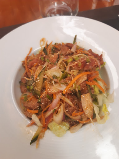 Read moreRestaurant qui au premier abord aparaît sympathique et abordable au niveau des prix, avec une diversité de plats, dont quelques uns végétariens. Le niveau sonore peut s'avérer inconfortable malgré une distance importante avec les tables voisines, l'insonorisation n'est pas bonne et les voix résonnent beaucoup. Le service est rapide et les serveurs aimables. Néanmoins quel dommage que les plats, pour une même table, ne soient pas servis en même temps ! De ce fait on regarde son conjoint manger son plat pendant que l'on attend le sien. La température de certains plats (curry de crevettes au lait de coco qui ressemble plutôt à une soupe avec de plus une bougie sous le plat!) et desserts ( flans coco) , est beaucoup trop élevée (plats certainement réchauffés au micro-ondes, sans vérification de la température), certains plats ont même une température inégale) ce qui ne permet pas de les apprécier( extrémités tièdes, centre brûlant) Afin d'éviter de se brûler le palais, il est nécessaire d'attendre qu'ils refroidissent ce qui gâche le bon déroulé d'un repas. Quant au riz thaï, il était trop cuit et la portion réduite. Beaucoup d'améliorations sont donc à travailler pour...