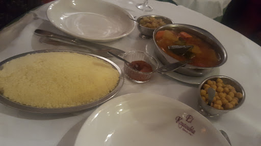 Quel Voyage decevant !. la graine de couscous n'a jamais été roulée , ni rencontré le smen, le beurre ou l"huile et pas salé.... Les légumes se resumes à des carottes, oignons, pois chiches et une rondelle de courgette. C'est chiche. les viandes boeuf, poulet et agneau sont seches et n'ont pas cuits avec les légumes. Même la merguez n'a pas été grllee, trop cuite et sans saveur. Le bouillon insipide est le résultat d'absence totale d'épices, de la pauvreté des légumes ( persil "arabe, carottes, oignons, courgettes, cardons, navets, poivrons, potiron, choux, artichauts, tomates, raz El out, carvi, cumin, coriandre, piment, sel et poivre) d'où un bouillon insipide dommage pour des habitues du maroc et de la cuisine orientale. Ma mère, sa famille ou ses amies embaument la cuisine et la salle de repas avec les effluves de couscous. les convives se regalent avec un couscous maison roulé à la main avec du smen, de l'huile d'olive vierges, salé et cuisant à la vapeur au dessus d'un bouillon riche et parfumé résultant du mariage des légumes avec la viande:et des épices a couscous. LE TAJINE DE POULET OLIVES - CITRONS BEDI AUX POMMES DE TERRES était pas formidable car même reproches. Manque d'assaisonnement et une cuisson séparée des produits réunit dans un tajine pour être rechauffer et servi dans un tagine. le thé à la menthe en guise de dessert et vraiment bon. J'ai mis 2,5 étoiles pour la décoration même un peu chargée et thé menthe .