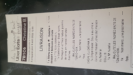 Je la mangeais tranquillement jusqu'a une bouchée ou je suis tombé sur du poivre qui m'a arraché la bouche alors que je n'y suis pas sensible. Alors gentillement et gêné, je dis au patron que je suis tombé sur du poivre et la je me fais prendre pour un con en m'expliquant que la pâte est assaisonnée et qu'ils ne rajoutent pas de poivre ensuite et que personne ne s'est jamais plaint et que je dois fumer pour avoir ressenti du poivre dans ma galette. Je pense quand même savoir ce que j'ai ressenti en bouche et que si la pâte uniquement etait assaisonée, toutes mes bouchées auraient été poivrées, mais ce n'était pas le cas. Juste une bouchée m'a anesthésiée la bouche.