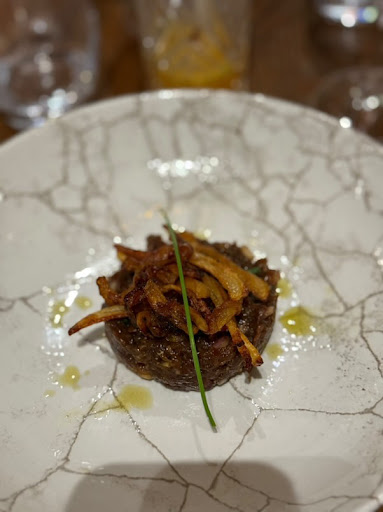 -un tartare fait avec du filet qui n’était pas du tout assaisonné, simplement coupé ce qui ne me choque pas pour autant même si cela reviens à de la viande cru et non pas un tartare préparé mais celui ci a été trempé dans une sorte de parmesan râpé sans goût ce qui donnait une texture en bouche désagréable en plus du manque de goût,