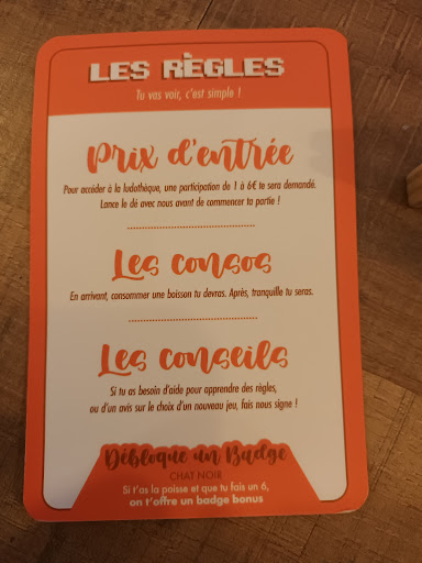 Je tiens à remercier le duo de patrons pour leur convivialité, gentillesse et pleins de qualités qui font qu’ils sont d’incroyables personnes. Leur entreprise propose un système d’entrée par personne entre 1-6€ selon un dés lancé en arrivant. Oui, c’est le coût pour avoir accès à un endroit formidable, spacieux, convivial et chaleureux remplie d’une bibliothèque de jeux juste TRÈS impressionnante. Il y a un bar qui propose des boissons alcoolisé ou non (je recommande vraiment le smootie mangue ou fraise) ainsi que de quoi grignoter avec des cookies / chips / bonbons et même des wraps en été ou des tartines gratinée en hiver excellent aussi.