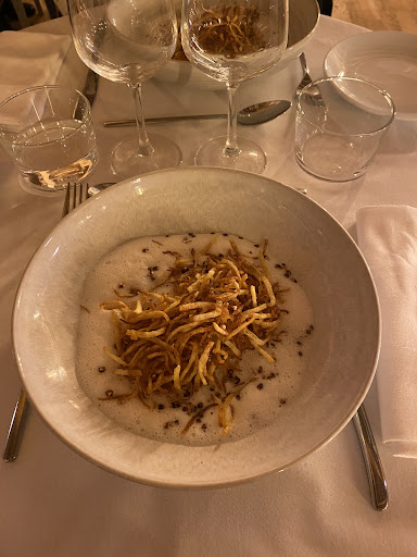 PAPILLES D OR 2025- attention on est sur du très très bon. Garés sur le parking d’en face, nous sommes descendus de la voiture en nous demandant si nous ne nous étions pas trompés. Nous avons passé la grille et avons poussé la porte sans grande conviction. Nous avons vu marqué « piscine ». Les dames a l accueil nous ont indiqué de pousser la porte et de continuer tout droit. Et là effectivement, nous avons levé la tête et vu ce restaurant ouvert, perché, et tout ce bois. Il faisait doux, c était chauffé, et soudain on a senti qu on allait passé un très bon moment. Ce fut le cas. Les tables sont espacées, disposées dans la continuité du comptoir et de la cuisine. Nous avons commencé avec 2 verres de Bourgogne. Il nous a été proposé le menu gastronomique (45 euros, en 6 parties), ou la carte. Au final pour un choix comme pour l autre, on se retrouve avec une addition similaire donc envisagez les 2 propositions. Nous avons pris la carte très intéressés par les propositions. Donc, entrée 1: tartelette, cèpes, escargots . Entrée 2: Courge rôtie. Un régal. La courge est extra de chez extra. En plats, ailé de raie, plat de, poitrine de cochon (fondante, succulente). Un sans fautes. Et en dessert, moelleux (excellent) et dôme crémeux pamplemousse (surprenant, un peu trop sucré à mon goût seul bémol de ce dîner). Le pain, extra. Encore une fois, pour moi le pain est un révélateur, un indicateur. Donc en résumé, quand on voit l adn culinaire , le Cv du chef, on a beaucoup d espoir. Les assiettes sont belles, soignées, bien proportionnées. Et à la fin du repas, on se dit, « je reviendrai et très vite pour voir le menu gastronomique ». A 2, le repas et le vin, 110 euros. Très très très très bon. Je m empresse de faire une nouvelle...