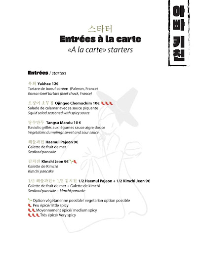 Étant d'origine coréenne , j'ai été titillé par les avis dithyrambiques sur internet dont le site thefork de ce nouvel établissement . Quelle fût ma surprise de retrouver l'ancien chef HJ kang du Soon derrière les fourneaux. Soon est déjà un restaurant coréen de très bonne réputation et dont j'ai conservé un excellent souvenir culinaire. Je vous le recommande , vous les internautes et les fans de la cuisine coréenne . Je me suis lâché sur les commandes quitte à partir en vacances avec des papilles flattées , un ventre gonflé , pas autant que le fils du Général du monde de Choi avec son palais de dobermann. Il ferait bien de tester ce restaurant d'ailleurs . 😂 . J'ai pris un poulet grillé Dak kanjang gui avec ses divers accompagnements et du poulet frit très aérien et succulent. Le jus qui en sortait avec cette croustillance c'était divin. Je reviendrai tester d'autres plats d'ailleurs. Le serveur qui prenait les commandes était fort sympathique , lui d'origine vietnamienne et m'a raconté un peu le parcours et sa venue dans l'univers gastronomique coréen. Une affaire familiale avec le chef coréen Kang. Malgré quelques délicatesses , ses efforts pour bien faire sont à louer. C'est le métier qui rentre , chaleureux , aimable , il a toutes les aptitudes pour assurer le service. La carte proposait des vins de grande qualité et plutôt judicieux. Le décor lumineux et sobre s'apparentait avec le calme de la salle. Harmonieux, discrétion dans une rue un peu à l'écart. Je pense que le restaurant manque de visibilité quant à sa localisation. Mais dans ce genre de restaurant, on y apprécie de déjeuner dans un havre de paix , où le bruit des baguettes , des cuillères tintent et le hochement de tête viennent accompagner et approuver la sensation d'exaltation culinaire. N'en demeure pas moins une apothéose gustative , là où on ressent l'expérience solide. Les années où le chef Kang a pu flatter sa clientèle diverse avec les effluves émanant de son seigneur domaine , les fours , les diverses casseroles. Un peu comme un chef d'orchestre sud coréen . C'est avec maestria qu'il revisite les grands classiques et y apporte sa touche de sensibilité. Bref Appa kitchen prospérera sans nulle doute compte tenu de l'excellence de la cuisine. C'est avec ces douces considérations que je départis et que j'attribue la symbolique note des 5* pour marquer mon enthousiasme. Coréen je suis , plus intraitable je suis , concernant la gastronomie coréenne. Parole de Coréen, je donne ma sainte bénédiction. Amen ou plutôt bon appétit...