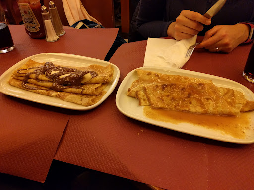 We had the house red wine which was lovely in a pitcher and crepes grand mariner. Both good and portion size is good. The crepes are cooked on a large skillet in the front of the restaurant and gives it authenticity as you watch as your crepe is sizzled and comes straight to your table. Very fresh and hot.