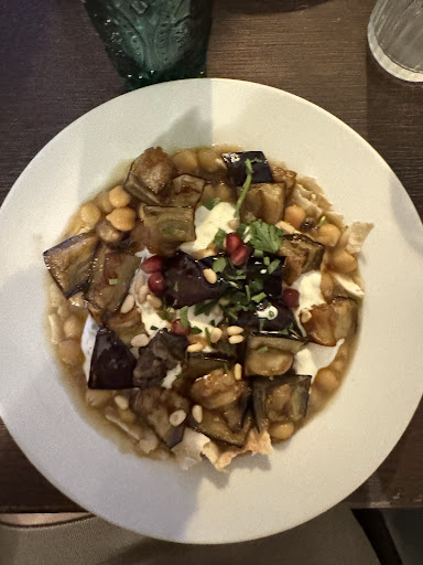 đEn plat, je me suis dĂ©lectĂ©e avec le Fatteh Batingen, que j'ai mangĂ© Ă nouveau lors de ma 2Ăšme visite đ Au fond de l'assiette se cachent des pains pita (spoiler), qu'on dĂ©couvre Ă la dĂ©gustation. Sur les galettes, on trouve de gros pois chiches fondants cuisinĂ©s dans une purĂ©e d'aubergines tiĂšde (bam), nappĂ©s d'une gĂ©nĂ©reuse couche de labneh, de mĂ©lasse de grenade, menthe, persil et pignons de pain (bam numĂ©ro 2).