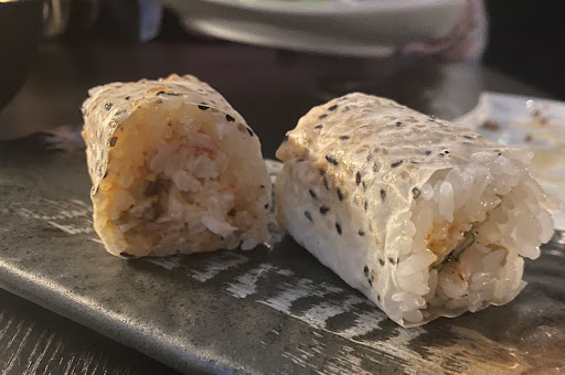 Spicy Tofu - the tofu was the low-class brown one, not the silky and smooth traditional Asian one. For the price of the dish -pure shame. Cucumber Sunomono - should be at least a bit pickled, but no, you get some fresh cucumbers drowning in vinegar. Oven Baked Crab Roll - in the picture below. Looks and tastes as if someone already ate it and could barely hold it in. Miso Soup - pure salt, uneatable.