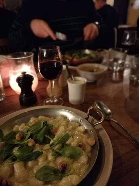 Je commence généralement mon repas avec un spritz, et pour la suite le vin des abruzzes est parfait en toutes circonstances (grosse déception de ne pas en trouver facilement chez les cavistes de mon quartier). Côté food c'est parfait également : en entrée (et à partager!), la buffala et la burrata sont délicieuses, je suis incapable de m'en passer. Et puis pour continuer, les gnocchis della casa sont di-vi-nes (c'est le seul plat que je mange chez eux, impossible de changer !). Je les demande en version végétarienne (donc sans le lard), et l'association crème de parmesan / noisette / épinard est juste ... parfaite. C'est bon, copieux, et savoureux. Alors oui, les pizzas ont également l'air très bonnes, mais moi je suis team gnocchis et je suis pas prête d'en changer pour le moment.