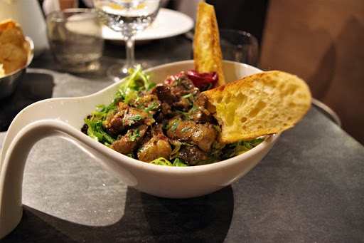 Read moreAtelier Maître Albert is the cutest, not-so-little upscale Rotisserie. It may be an annex of the famous house Guy Savoy, but the high-end gastronomic side has been replaced by comfy, heart-warming, home- style kind of cooking and ambiance. With a prime location near Notre-dame, in a quiet street of the mazy 5th district, the chic charcoal-colored establishment seems very popular both with locals and tourists. It's a contemporary sight for a very old part of Paris. The dining room is separated in a duality of space. One side is the Vinotheque, perfect for a quick lunch or to stare at their whole wine collection all night. The other side is way cosier, intimate with a fireplace, dimmed lights, the roasting wall of the kitchen and just a warmer feeling overall. The menu is based on the very idea of conviviality and liveliness. The small amuse-bouches were a nice touch and made the very little wait for the efficient running around staff to come take the order. My entrée was a superbly rich velouté poured directly before me in a filled saucepan. My friend had the seasonal salad and sauteed chiken livers which was highly appraisable in intensity of flavour. Main dishes were, plates to share, a choice of spit-grilled meats, vegetables and fish with some cheesy gratin as side dishes. It's simply delicious and copious. It was a fantastic roasty diner I'll definitely try (and fail) to reproduce home. So, I guess I'll have to go back next time...