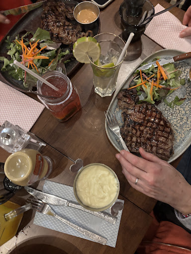 Read moreWenn man rein kommt ist es perse erstmal ganz nett. Schönes Ambiente, angenehme Beleuchtung und bequeme Stühle. Gleich bei der Bestellung fällt aber auf, dass das Personal Mal so gar keinen Bock auf sein Leben hat und will dich das auch spüren lassen. Weder hat man uns ausreden lassen, noch war man in irgendeiner Form freundlich oder willkommend eingestellt. Es hat sich eher angefühlt als würde man stören. Das Essen war alles in allem ok. Man ist satt geworden. Das sollte es gut zusammen fassen. Ich hatte einen Cheesburger mit Housemade Pommes, die Majo die dazu gereicht wurde stand aber definitiv schon länger irgendwo rum. Absoluter Tiefpunkt war der Virgin Colada (Erdbeer), der wirklich zu 100% nach Erdbeermilch geschmeckt hat. Mag sein dass die Meinung bei alkoholfreien Getränken auseinander gehen, aber für 7,00€ möchte ich trotzdem gerne etwas mehr als nur den Erdbeersirup schmecken. Verständlicherweise hat die Endrechnung mit 49,00€ mächtig wehgetan (alkoholfreie Getränke werden in der Happy Hour anscheinend trotz Vermerk auf der Karte nicht berücksichtigt). Für den Nachtisch haben wir uns dann doch lieber den nahegelegenen...
