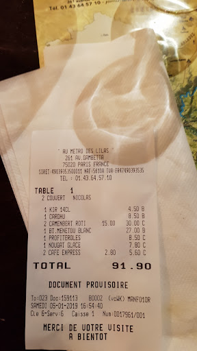 Read moreBonjour a tous, juste vous deconseiller vivement cette Brasserie "Au metro " de la porte des Lilas . Ils sont tres cher pour des frites congeles, une bonne viande (je dois reconnaitre ) ,4€50 pour un demi a table comme aperitif (alors qu'au bar pour 3 demi ils ont encaisse 7€ ...va comprendre) , 24€ une bouteille de Corbieres (4.50€ ou 6€ a Carrefour) Accueil pas tres chaleureux , ils ont cru qu'on etait des touristes , j'etais avec ma femme et mes enfants espagnoles et 2 Amis Parisiens . Une addition pour touristes japonais. Bref , nous ne renouvellerons pas l'experience , en plus le signale etait que la salle etait vide , peut etre qu'a cause du Covid 19 les restaurateurs augmentent leur prix à Paris (pas tous) et se foutent de leur clients (pas tous) , mais là vaiment 196€ a 6 (2 ado) , j'ai trouvé que c'etait salé pour etre à la porte des Lilas. Le but etait clairement qu'on reviennent pas , lamentable qu'on prenne les Clients pour des cons ou des Vaches a lait, je donne 2 cartons...