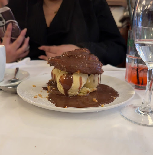 We ended our meal with the highly praised profiterole dessert which was quite good with a warm and very light chocolate sauce poured over the ice cream filled choux.