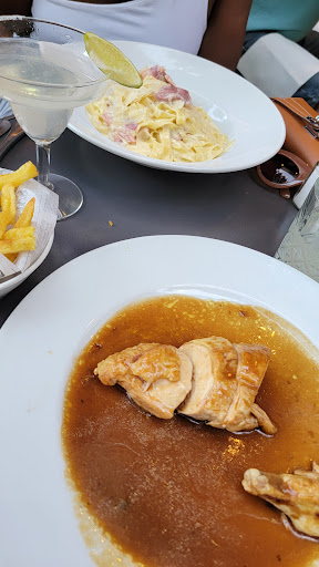 This restaurant is just next to another one which does pizza's. They obviously have a tie in to each other as our waiter took drinks next door and people sat near us ordered pizza's to their table. The food was tasty and filling I had a burger image attached, fries are separate so you can pick and choose your side. As you would expect the drinks were the usual, they do have happy hours think it as 3 to 8pm which seems the usual time for local bars. Would happily eat there again, helped by them speaking...