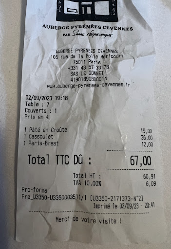 Read moreThat's a good example of how service can kill the cook's result....I believe that all the waiters should have a bit of training on basic things like how to welcome the guests, how to open a bottle of wine and most of all how important is to give the right information. We asked the waitress if we were going to pay extra because the price of the menu was cheaper than the price of the main course itself, and the answer was no, everything is included in the price of 39 euros. In the end, we had an extra amount of money that we had to pay in the bill ( a plus 22E in total ), as you can see on the receipt. The sound of the wine corks in all over the restaurant was embarrassing, and the fact also that they almost put the corks inside their noses after opening every bottle. I could also suggest that they should show the label to the client before. The atmosphere had some issues that made our visit unpleasant as well. A heavy smell of mold in all over the building can be understood if you consider the fact that the building is so old, but I think that is too much for a restaurant. Our clothes also brought that smell from the sale to our house. Although it could be a four star review because the kitchen almost saved our night with this pate en croutte and of course this amazing cassoulet...bravo!!! 👏 I was a little bit more disappointed also from the kitchen because the deserts that looked great were tasty but not...